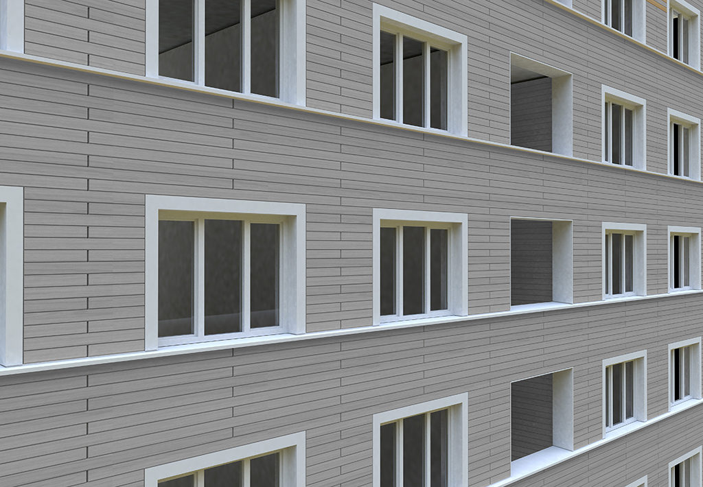 Die baurechtlich erforderlichen Brandriegel werden in Brüstungshöhe angebracht und zu einem gestaltprägenden Merkmal erhoben. Die opaken Anteile haben horizontal wie vertikal die gleiche Stärke – das gibt dem Gebäude eine ruhige, elegante Ausstrahlung. Das Prinzip der Öffnungen folgt dem Gedanken des modularen Grundrisses. Alle Fenster bzw. Loggien sind gleich. Die Fenstergröße ist so gewählt, dass die Aspekte Tageslicht, Sicherheit und Wärmeschutz optimal ausgewogen sind.